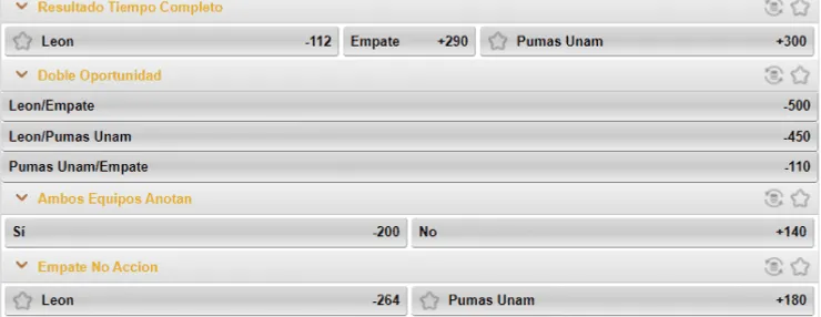 Si te la juegas por un favorito para este juego, en Caliente.mx el que corre con la ventaja es León, que paga -112 en desmedro de los +300 que paga Pumas UNAM. El empate, en tanto, paga +290 si crees que ese será el resultado final.