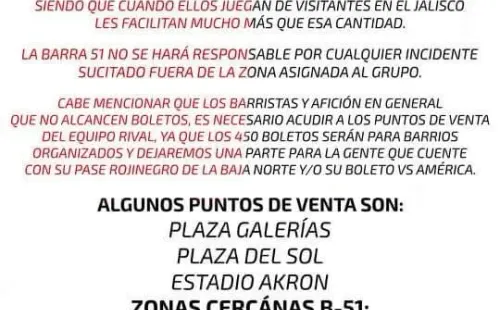 Por ahora son solamente 450 las entradas otorgadas para los fanáticos de La Academia, algo que no ha sido bien visto en la mitad rojinegra de la ciudad, por lo quemuchos las adquiriránpor sus cuentas y ahí corre el riesgo de que haya células de la 51 por varias zonas de la casa del Guadalajara.