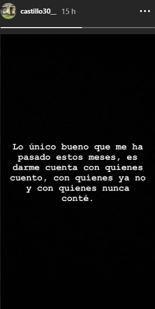 “Lo único bueno que me ha pasado estos meses es darme cuenta con quienes cuento, con quienes ya no y con quienes nunca conté”, escribió en una historia de Instagram.
