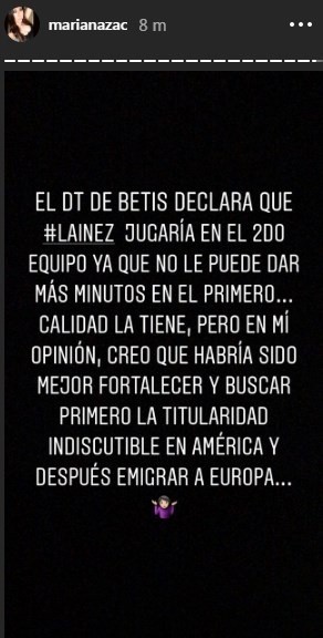 En una historia de Instagram, la conductora escribió: “El DT del Betis declara que Lainez jugaría en el segundo equipo ya que no le puede dar más minutos en el primero… calidad tiene, pero debería haber fortalecido mejor y haber buscado primero la titularidad indiscutible en el América y después emigrar a Europa”.