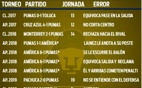 Saldívar debutó en 2010 en Pumas y desde ese añojuega en el club. A lo largode su carrera ha cometido varios errores graves que le han costado el partido a los Auriazules.