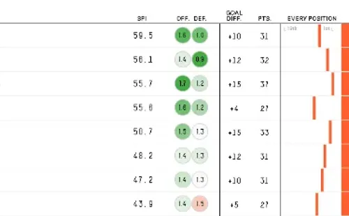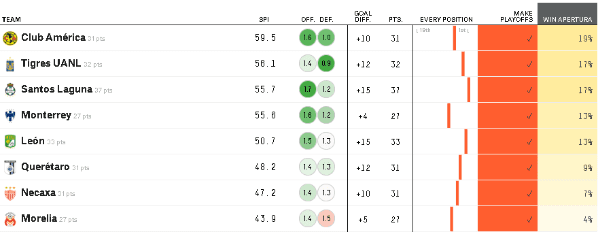 Five Thirty Eight, famosa página de proyecciones, acomodó a los ocho equipos calificados a la Fiesta Grande en orden de posibilidades de levantar el título. Además, le dio un porcentaje a cada equipo.