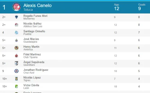 En cuanto a la tabla de goleo individual, podemos ver que Alexis Canelo volvió a liderar en soledad con nueve goles tras su tanto con Toluca ante Puebla. Por su parte, Rogelio Funes Mori de Monterrey continúa con ocho dianas aunque con un juego pendiente, y Nicolás Ibáñez (Atlético de San Luis) sigue en la misma línea dado que no pudo anotar en esta fecha.