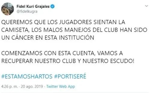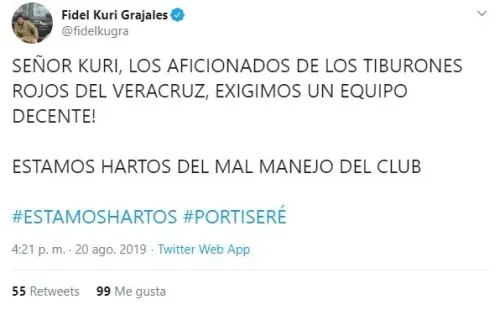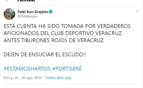 “ESTA CUENTA HA SIDO TOMADA POR VERDADEROS AFICIONADOS DEL CLUB DEPORTIVO VERACRUZ, ANTES TIBURONES ROJOS DE VERACRUZ. ¡DEJEN DE ENSUCIAR EL ESCUDO!”, reza un tweet que manifiesta absoluta disconformidad.