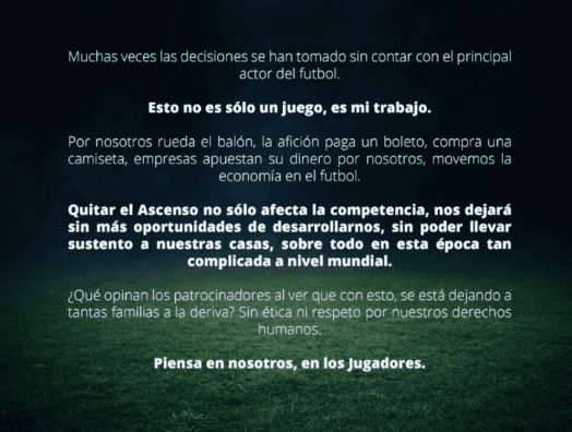 Del mismo modo, jugadores del Ascenso han llamado a no eliminar la liga,por medio de un comunicado. Algunos de ellos fueron:Daniel “Chepe” Guerrero, Melvin Brown, Alejandro Vela, Darío Carreño, Carlos “Gullit” Peña, Leobardo López, Omar Esparza, entre otros.