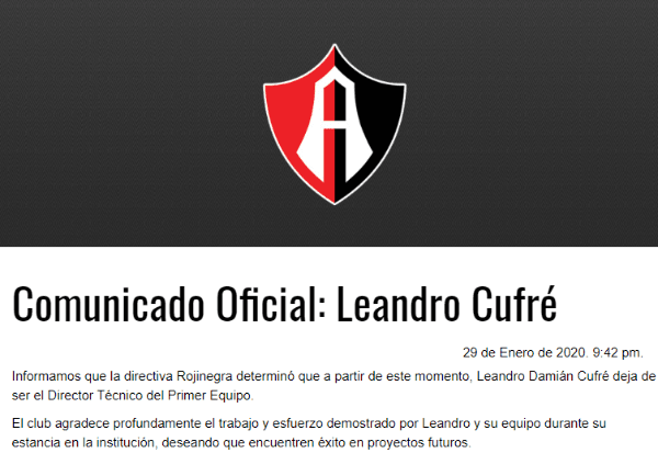 24 horas después de la eliminación ante Toluca por los octavos de final de la Copa MX, la directiva de Atlas decidió darle las gracias a Leandro Cufré y no contar más con él como entrenador para la actual temporada que recién comenzó.