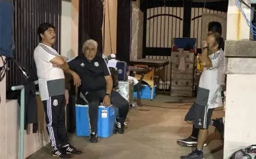 En los vestuarios apenas entraron los futbolistas. La utileros tuvieron que quedarse afuera con todos sus materiales, por lo que improvisaron una sala de masajes al aire libre.