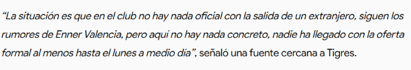 “La situación es que en el club no hay nada oficial con la salida de un extranjero, siguen los rumores de Enner Valencia, pero aquí no hay nada concreto, nadie ha llegado con la oferta formal al menos hasta el lunes a medio día”, explicó una fuente cercana a Tigres.