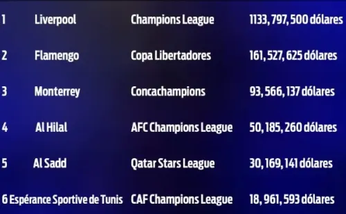 Por encima del cuadro mexicano figuran Flamengo con 161 millones 527 mil 626 dólares y el Liverpool con 1133 millones 797 mil 500 dólares.
