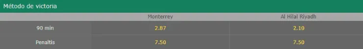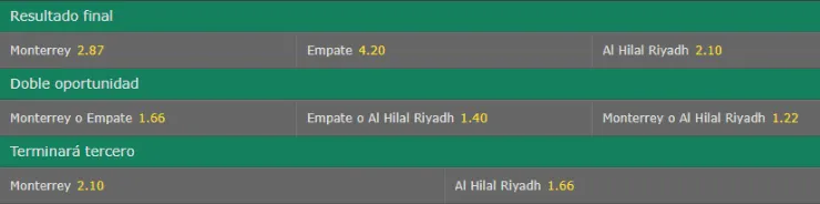 Con el análisis que nos entrega bet365, el favorito para vencer en este juego de definición del tercer puesto del Mundial de Clubes es Al Hilal, cuyo triunfo paga 2.15 veces lo apostado. En tanto, si tienes la fe que Monterrey se llevará el tercer puesto en Catar, paga 2.90 veces lo apostado. Si eres de quienes piensa que terminará en los 90 minutos con un empate, paga 4.00 veces lo jugado.