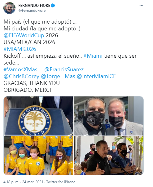 “Cuando me enteré que tendríamos el mundial en casa, lloré. Hoy, además, quiero que sea en mi ciudad. Mirar a estos niños y saber que son el futuro del fútbol, y que Miami puede ser sede del mundial en 2026, es un verdadero gol de media cancha”, contó Fernando Fiore, histórico periodista deportivo con más de ocho mundiales cubiertos y quien es parte del equipo que impulsa a Miami como ciudad sede de la Copa del Mundo.