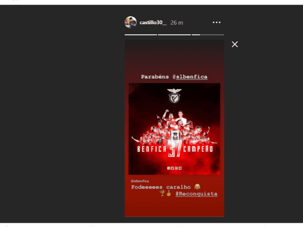 De hecho, en su cuenta oficial de Instagram, publicó dos historias en las últimas horas: una que parece dedicada a sus detractores y la otra felicitando a Benfica por ser Campeón una vez más en Portugal.