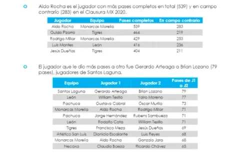 Entre otros casos, se encuentran las 123 conexiones entre Gustavo Cabral y Óscar Murillo en Pachuca, como las 122 que menciona Opta entre Luis Montes y Jean Meneses en León y CliffordAboagyecon Jaime Gómez en Querétaro.
