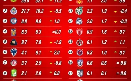 Como era de esperarse, el América ocupa el primer puesto de esta tabla. Lo siguen Chivas y Cruz Azul.
