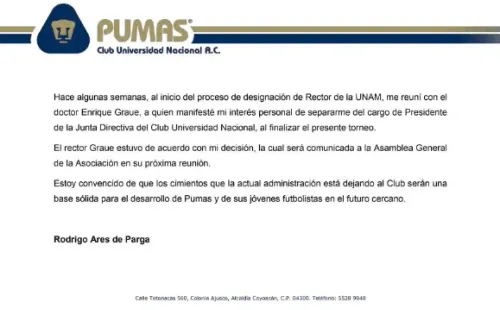 Luego de horas de incertidumbre y un sinfín de rumores llegó la información oficial: Rodrigo Ares de Parga anunció que dejará la presidencia de Pumas de la UNAM.
