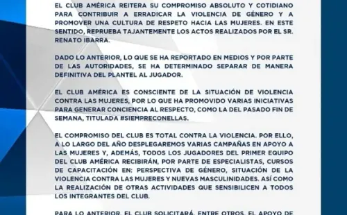 “El Club América reitera su compromiso absoluto y cotidiano para contribuir a erradicar la violencia de género y a promover una cultura de respeto hacia las mujeres. Dado lo anterior, se ha determinado separar de manera definitiva del plantel a jugador”, se expuso a través de un comunicado oficial.