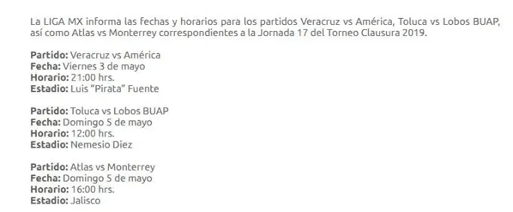 Por ejemplo Veracruz – América en el Estadio Luis Pirata Fuente, estipulado inicialmente para el sábado 4 de mayo, se disputará el viernes 3 desde las 21 horas.