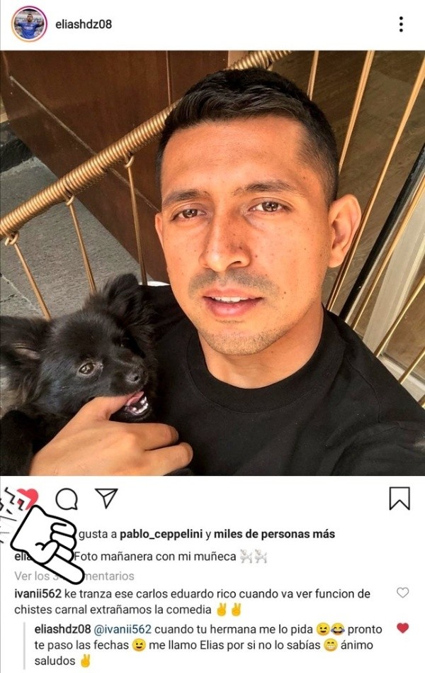 “Foto mañanera con mi muñeca”, escribió el centrocampista ofensivo, adjuntando una foto con su perro. Y a eso recibió un raro comentario de un seguidor: “ke tranza ese carlos eduardo rico cuando va ver funcion de chistes carnal extrañamos la comedia”.