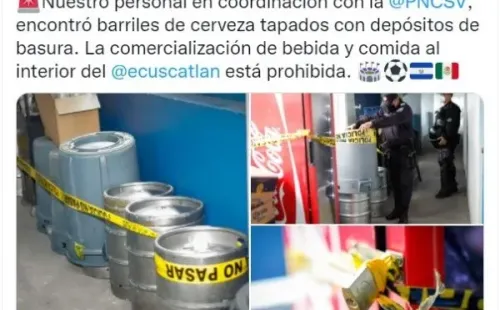 “Nuestro personal en coordinación con la protección civil de El Salvador, encontró barriles de cerveza tapados con depósitos de basura. La comercialización de bebida y comida al interior del estadio Cuscatlan está prohibida”, indicó la Protección Civil, de la capital salvadoreña.
