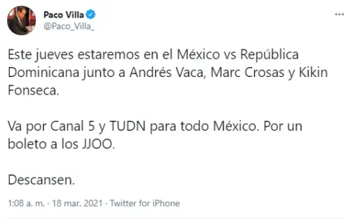 “Este jueves estaremos en el México vs. República Dominicana junto a Andrés Vaca, Marc Crosas y Kikin Fonseca. Va por Canal 5 y TUDN para todo México. Por un boleto a los Juegos Olímpicos”, compartióPaco Villa a través de su cuenta de Twitter, donde también reveló al equipo que lo acompañará esta tarde en la transmisión.