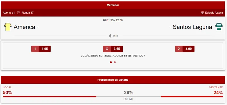 Caliente.mx nos anticipa en sus momios que el favorito para quedarse con este juego será el América, cuyo momio indica que su triunfo paga -106. Si te la juegas por un empate, este resultado paga +265, y si crees que Santos será el vencedor, este momio paga +300.