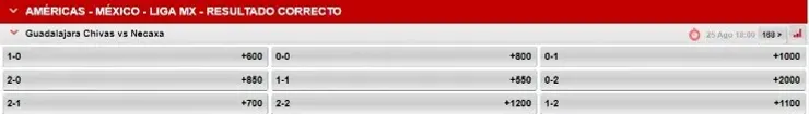 Finalmente, Chivas de Guadalajara recibirán este domingo 25 de agosto, a las 17:00 hrs, en el Estadio Akron a Necaxa. El Rebaño Sagrado viene de caer 4-3 ante León, como visitante, y quiere extender su condición de invicto en casa. Mientras que los rojiblancos exhiben una cadena de tres victorias como anfitriones en la Liga MX, ante León (2-1), Tigres UANL (2-0) y Atlético de San Luis (3-0). Para Caliente.mx, el favorito es Chicas, con +100. El empate paga +250 y un triunfo de Nexaca paga +290.