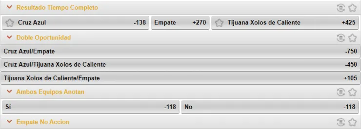 De acuerdo a los momios que Caliente.mx indica, el triunfo del Cruz Azul paga -138, ante los +425 que paga el triunfo de Tijuana. Si eres de quienes se la juega por el empate, paga +270.