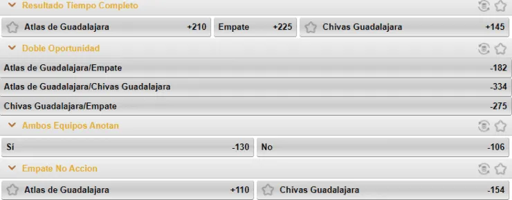 Según los momios que nos entrega Caliente.mx, el favorito para vencer este juego son las Chivas, que pagan +145, en desmedro de los +210 del Atlas. Si eres de los que se la juega por el empate, paga +225.