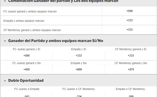 Si piensas que el que abrirá el marcador será Juárez, este momio paga +130, y si crees que serán los Rayados los que marcarán el primer gol, paga -125. Ahora, si eres de los que piensa que no habrán goles en este primer juego, paga +800.