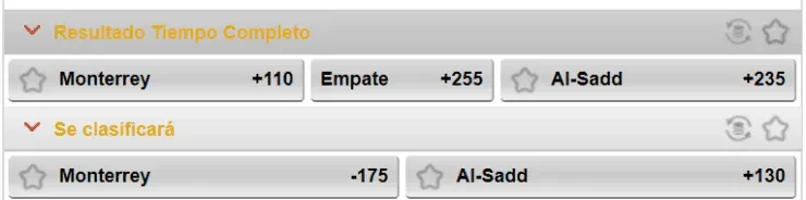 En el análisis que nos entrega cada semana Caliente.mx, el favorito para quedarse con esta llave del Mundial de Clubes será el Monterrey, cuyo triunfo en los momios paga +105. Si piensas que el juego se lo lleva Al Sadd, paga +240. Si eres quien piensa que en los 90 minutos el encuentro termina en empate, paga +250.