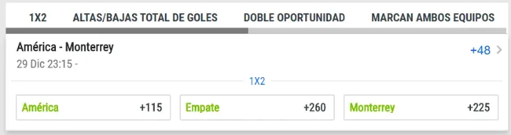 De la mano de Codere, los momios indican que el favorito para quedarse con el segundo partido de la final del Apertura de la Liga MX es el América, que paga +115. Ahora, si te la juegas por el empate, paga +260. Y si crees que serán los Rayados los vencedores, paga +225.