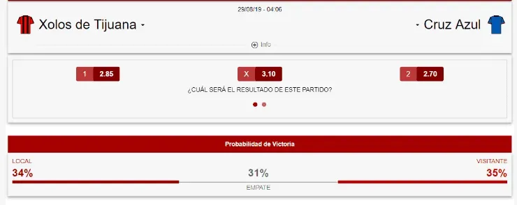 Para el miércoles 28 de agosto, a las 21:06 hrs (centro de México), Cruz Azul visita a Tijuana luego de acumular nueve puntos, en la última posición de la zona de Liguilla, a seis puntos del líder Santos Laguna. Para Caliente.mx, el favorito de este juego es La Máquina, ya que paga +170, un empate paga +210, y el triunfo de Tijuana +185.