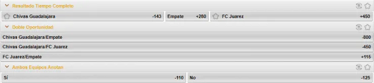 En los momios de Caliente.mx, el favorito para ganar este encuentro son las Chivas de Guadalajara, cuyo triunfo paga -138. En tanto, si eres de quienes cree que el triunfo en la jornada será de FC Juárez, el momio paga +425. Ahora, si piensas que el resultado final de este juego será un empate, paga +200.