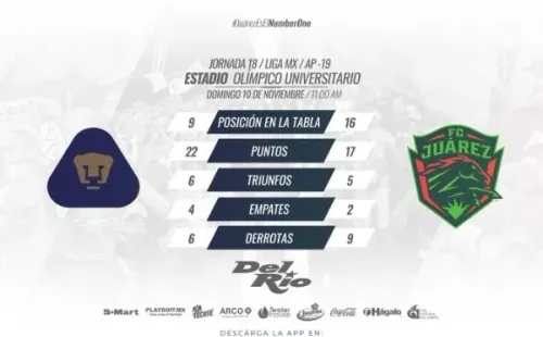 Pumas y Juárez serán rivalesen un duelo correspondiente a la jornada 18 de la Liga MX.