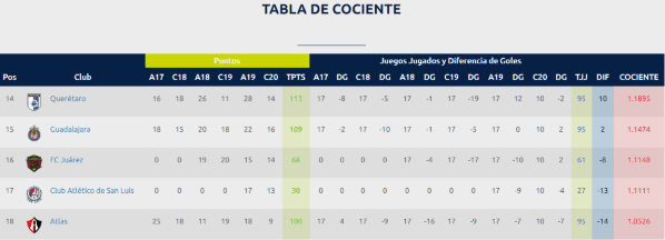 Mientras que los Bravos de Juárez, que llegaron a la Primera División el año pasado al adquirir la plaza de Lobos BUAP, se ubican en el sitio 16 con apenas cuatro torneos contabilizados.