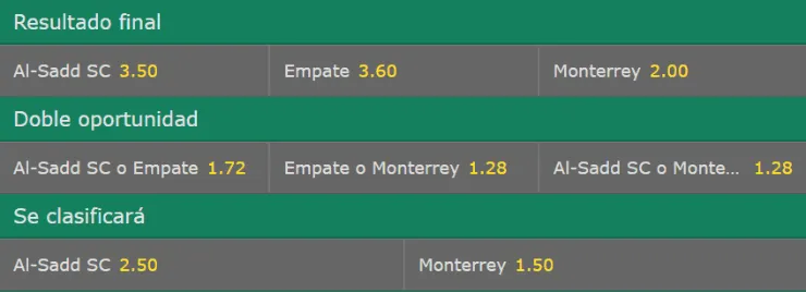 Con el análisis que nos entrega bet365, el favorito para vencer en este juego de los Cuartos de Final del Mundial de Clubes es el Monterrey, cuyo triunfo paga 2.00 veces lo apostado. En tanto, si te la juegas por el triunfo de Al Sadd, paga 3.60. Y si piensas que terminará en un empate en el tiempo regular, paga 3.50 veces lo apostado.
