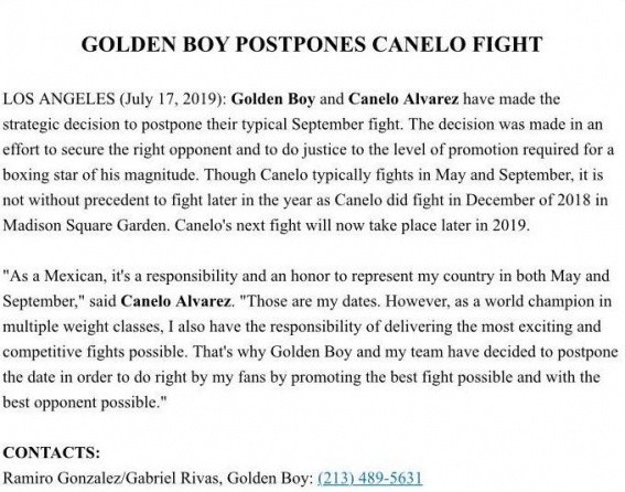 La promotora de eventos Golden Boy anunció a través de un comunicado que el boxeador mexicano Saúl “Canelo” Álvarez no peleará en septiembre de este año y deja de esta forma abierta la tradicional fecha de independencia.