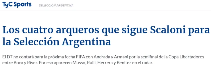 Trasladándose a los nombres propios en cuestión, Scaloniestaría siguiendo de cerca las actuaciones deJuan Musso (Udinese -Italia-),Gerónimo Rulli(Montpellier -Francia-), Guido Herrera(Talleres -Argentina-) yWalter Benítez (Niza -Francia-).