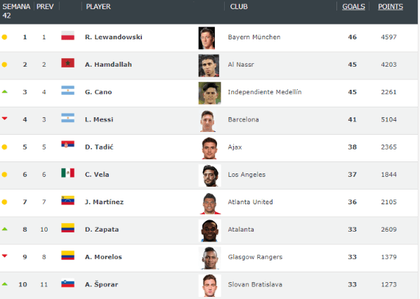 El delantero mexicano, que lleva 34goles en total en esta temporada, está en el sexto puesto del ranking. ¿Quiénes están por encima? Robert Lewandowski (Bayern Munich), Abderrazak Hamdallah (Al Nassr), Germán Cano (Independiente de Medellín), Lionel Messi (Barcelona), Dusan Tadic (Ajax).
