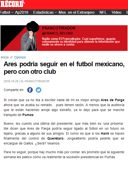 “Les cuento una última del presidente, que más bien es ‘una próxima’. Me dice que Ares de Parga podría seguir ligado al futbol en un futuro no lejando, gracias a alguno de sus amigos. El rumor es que si los Hans se hacen finalmente del control de Querétaro, Jorgealberto podría pedirse que se encargue de los Gallos. ¿Será? Veremos”.