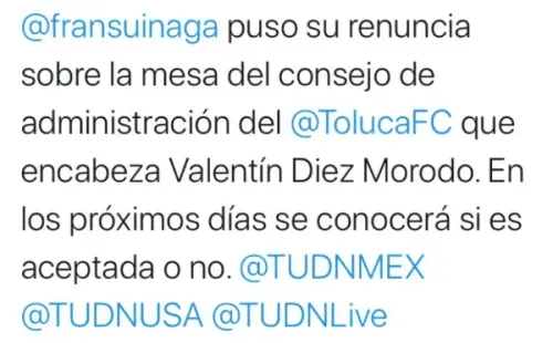“Suinaga puso su renuncia sobre la mesa del consejo de adminsitración de Toluca que encabeza Valentín Díaz Morodo. En los próximos días se conocerá si es aceptada o no”.