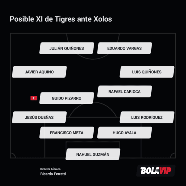¿Cómo quedaría la formación titular de Tigres UANL ante Xolos? Si el galo no está al 100% sería: Nahuel Guzmán; Luis Rodríguez, Hugo Ayala, Francisco Meza, Jesús Dueñas; Luis Quiñones, Rafael Carioca, Guido Pizarro, Javier Aquino; Eduardo Vargas y Julián Quiñones.