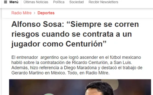 En diálogo con Radio Mitre, Alfonso Sosa, DT del elenco de México, hizo referencia a lo sucedido entre Ricky y Eduardo Coudet en el Estadio Monumental (partido en el que la relación entre ambos se rompió) y señaló: “No temo que me pase lo mismo que a Eduardo Coudet. Ya pagó y él lo sabe”.