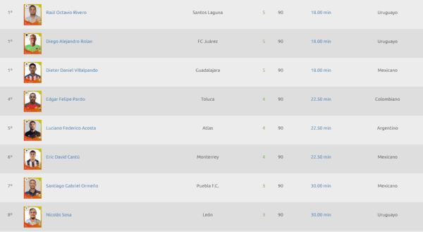 Más atrás, aparecen Felipe Pardo (Toluca), Luciano Acosta (Atlas) y Eric Cantú (Monterrey), todos con tres conversiones.