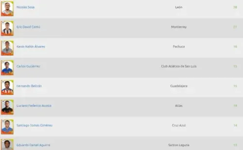 Más atrás le siguenEric Cantú(Rayados) con 27 tantos,Kevin Álvarez (Pachuca) con 16, Carlos Gutiérrez(San Luis) con 15, Fernando Beltran (Chivas) con 15, Luciano Acosta(Atlas)ySantiago Giménez(Cruz Azul) con 14, y Edurdo Aguirre y Giovani Dos Santos con 13 anotaciones.