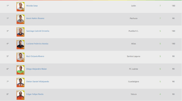 Más, aparecen Santiago Ormeño (Pachuca), Luciano Acosta (León), Raúl Rivero (Santos), Diego Rolan (Juárez) y Dieter Villalpando(Chivas), todos con cinco conversiones.