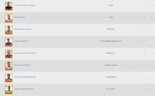 Más atrás, le siguen Nicolás Sosa (León) con ocho tantos y Kevin Álvarez (Pachuca) con siete conversiones.