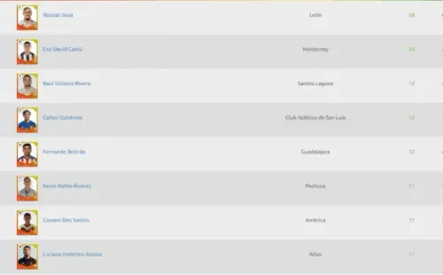 Más atrás le siguenEric Cantú(Rayados) con 24 tantos, Carlos Gutiérrez (San Luis) y Octavio Rivero (Santos) con 12,Fernando Beltrán (Chivas)con 12 anotaciones, y Luciano Acosta(Atlas),Kevin Álvarez(Pachuca) y Giovani Dos Santos (América) con 11 conversiones.