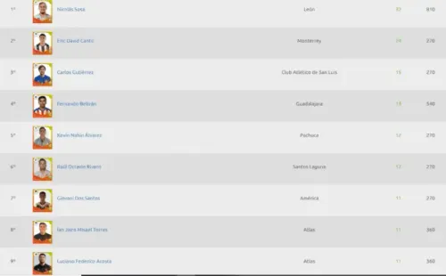 Más atrás le siguenEric Cantú(Rayados) con 24 tantos, Carlos Gutiérrez (San Luis) con 15, Fernando Beltrán (Chivas) con 13, Kevin Álvarez (Pachuca) y Octavio Rivero (Santos) con 12, y Giovani Dos Santos (América)con 11 conversiones.