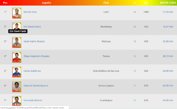 Eric Cantú, con 28, es el lejando seguidor del uruguayo. El elemento de Monterrey acumula 28 tantos. Kevin Álvarez, del Pachuca, suma 18 dianas y se colocó en la tercera ubicación.